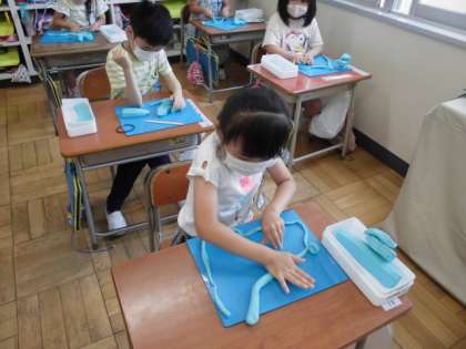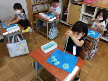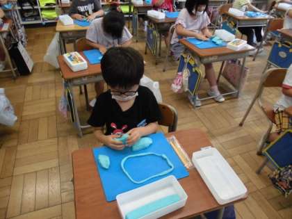 図画工作科の学習で、ひもひもねんどをしました。ねんどを伸ばしてひも状にし、ぐるぐるうずまきを作ったり、重ねてみたりしました。