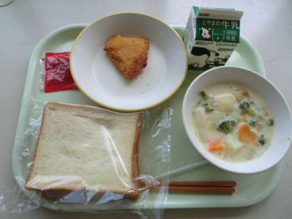 今日の献立は、「牛乳、食パン、ソフトカレイフライ、クリーム煮、いちごジャム」です。