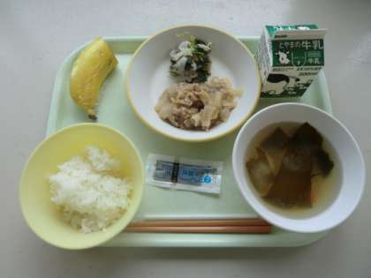 今日の献立は、「牛乳、ごはん、豚肉のおろしいため、ゆかりあえ、じゃがいものみそしる、のりつくだに、バナナ」です。