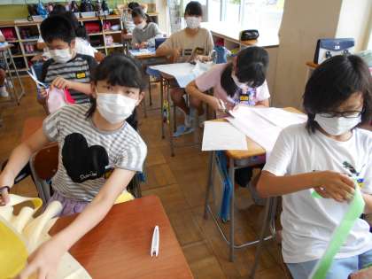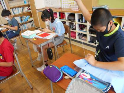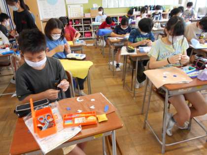 家庭科の学習でクッション作りをしています。自分のお気に入りのクッション、家族のためのクッションなど、目的に応じてデザインを考え、一人一人思い思いのクッションを作ろうとしています。久しぶりに裁縫道具を使用するという子供もいて、針に糸を通すこと、玉結びの手順などを思い出しながら楽しそうに製作しています。