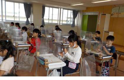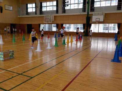 写真(上)は、体育「ミニハードル」の授業で、自分に合ったインターバルを跳んでいる様子です今回は、ミニハードルを「遠くから跳び、近くにおりる」ことを目標に、それぞれが取り組んでいました。「高く跳ぶのではなく、またぐ感じかな」と考えている子供の様子がみられました。