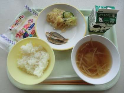 今日の献立は、「牛乳、ごはん、こあじのからあげ、バンサンスー、キムチスープ、ブルーベリークレープ」です。