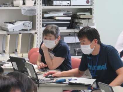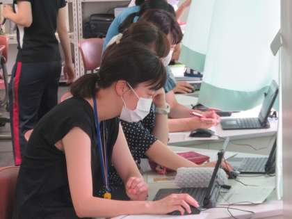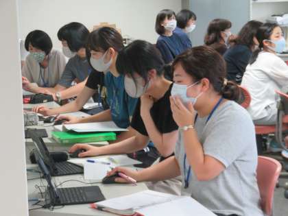 先生方が、ウェブ上で、子供たちと双方向の授業をするための設定や技能について研修しています。