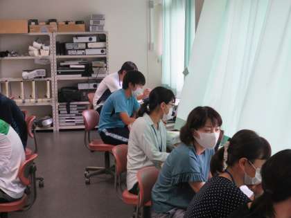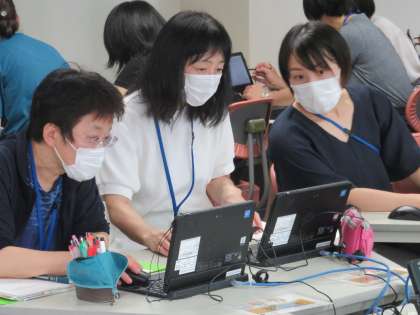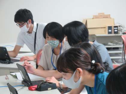 先生方が、ウェブ上で、子供たちと双方向の授業をするための設定や技能について研修しています。