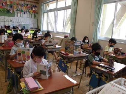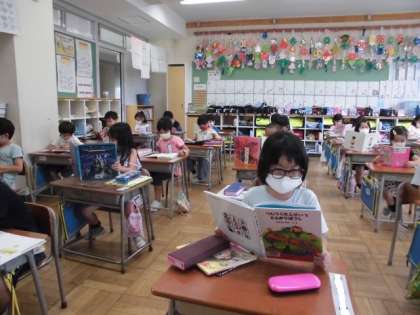 本の好きな子供たち。図書室の利用の仕方もしっかりと身に付きました。教室で本を読んでいる時は真剣そのものです。