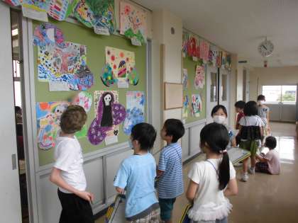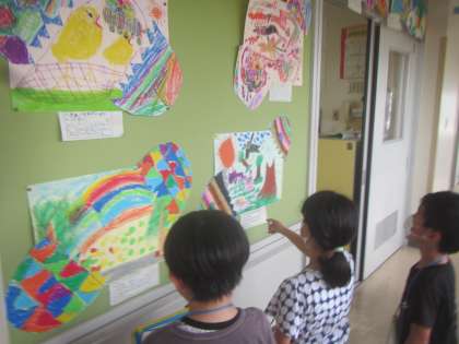 他のクラスの友達の作品も興味津々で鑑賞し、すてきだと思うところや工夫しているところをたくさん見つけていました。