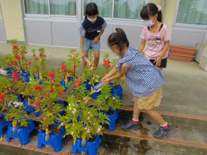 ホウセンカは赤色や白色のきれいな花が咲きました。どうして花の色が違うのか不思議そうです。