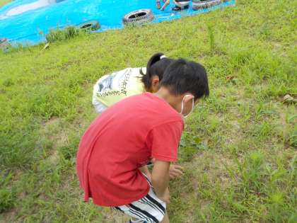 今日の休み時間の様子です。新庄の森で、カマキリやバッタ、コオロギなどをつかまえています。「このバッタは羽がないからまだ幼虫だね」「カマキリはまだ小さいから、このあと脱皮するんじゃない」などと、理科でモンシロチョウやトンボの成長の仕方について学習したことが生活の中でも生かされていました。