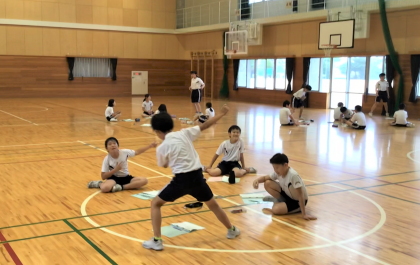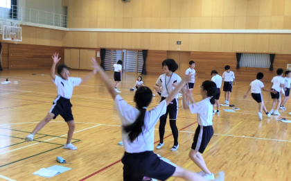 自分で考えたエアロビクスの動きを友達に披露しました。