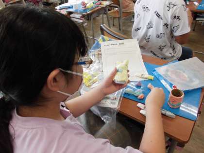 図画工作科の学習では、ハッピー小物入れを作りしました。子供たちは友達の作品を見て褒め合いながら、うきうきと取り組んでいました。