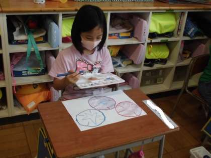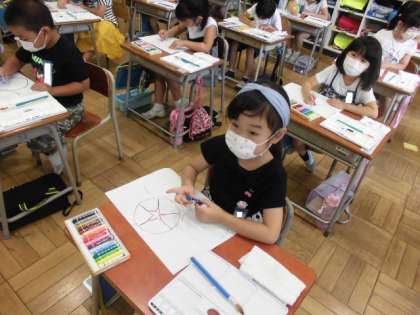 図画工作科の学習で、育てているあさがおの絵を描き、水彩で色を塗りました。初めて色を混ぜる練習をした子供たち。混ぜる量によって様々な色ができることを学習しました。