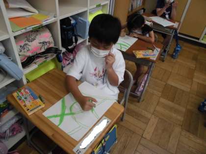 8月3日(月) 1年生 あさがおのつるとはっぱをかいたよ