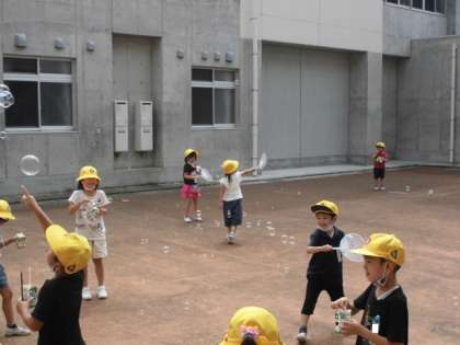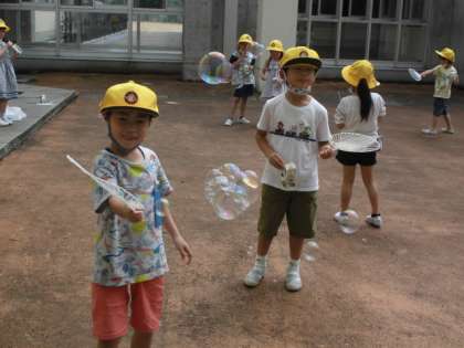 生活科の学習で、シャボン玉遊びをしました。持ってくる道具を自分で考えて、大きなシャボン玉を作ろうと張り切っていた子供たち。楽しみながら、工夫を見付けていました。