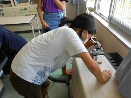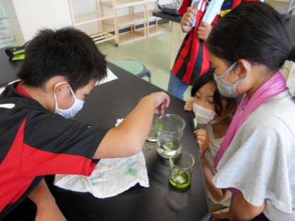 先月まで天候が悪く、なかなか実施できなかった、理科の葉にでんぷんができるかどうかの実験を行いました。前日に葉にアルミホイルを巻き、朝一部のアルミホイルを外し、午後からエタノールやヨウ素液を使って実験を行いました。合わせて微生物を顕微鏡を使用して観察する活動も行いました。待ちに待った実験とあって、子供たちは友達と協力しながら楽しく安全に実験に取り組むことができました。