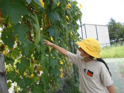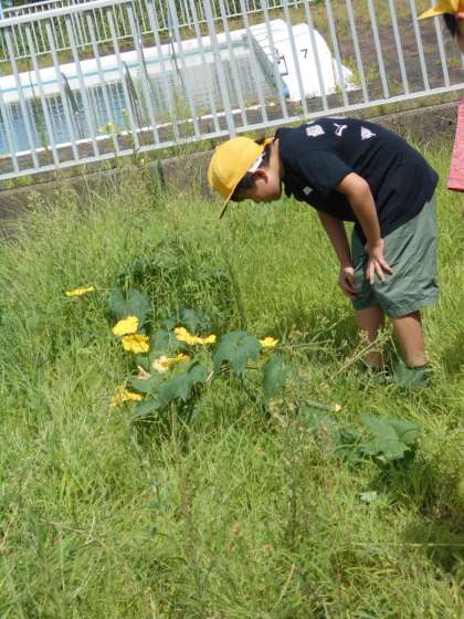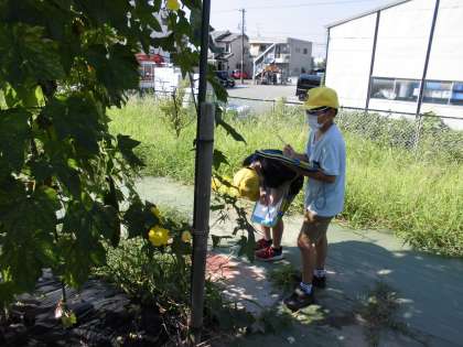 ヘチマの観察に行きました。子供たちは、大きく成長したヘチマを見て驚いていました。花や実など、細かなところまでじっくり見ていました。