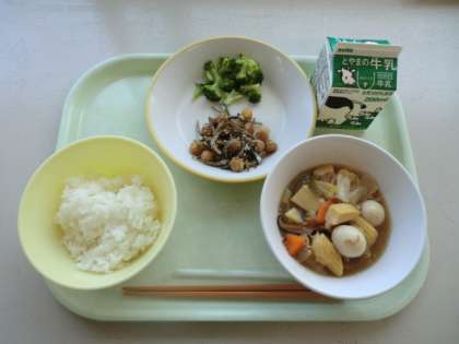 今日の献立は、「牛乳、ごはん、小魚入りフライビーンズ、ゆでブロッコリー、八宝菜」です。