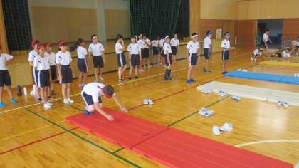 1組では体育科の時間にマット運動の学習を始めました。これまでの学年で学んできた内容を振り返り、いろいろな技ができるように練習に取り組んでいきます。