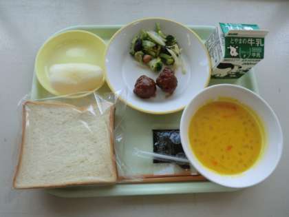 今日の献立は、「牛乳、食パン、肉だんご、ビーンズサラダ、かぼちゃポタージュ、チョコレートクリーム、なし」です。