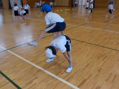 2年生は体育の時間にチャレンジわざ7の活動に取り組んでいます。金銀銅のスターシールをもらえるように、めあてに向かってがんばっています。