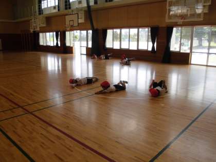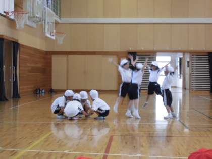 体育の学習で表現運動をしています。今日は、体育館を広々と使っていろいろな動きを試した後、団ごとにテーマを決めて体いっぱいで表現しました。