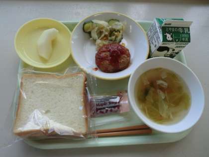 今日の献立は、「牛乳、食パン、ハンバーグのマスタードソースかけ、コーンサラダ、レタススープ、メープルジャム、梨」です。