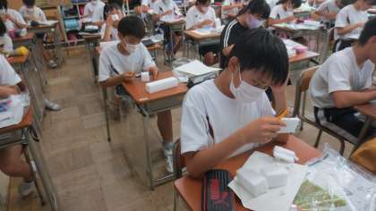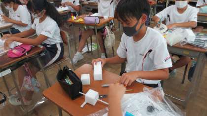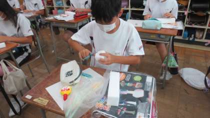 図画工作科「光の形」の学習で作品づくりに取り組んでいます。材料の形を整え、どのような作品にしようかと楽しみながら制作していました。