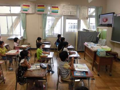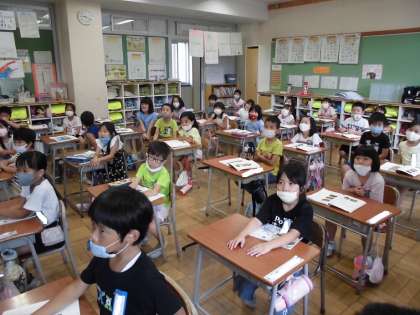 国語科で学習している「うみのかくれんぼ」。実際にどのように姿を隠しているのか、みんなで確認しました。海の生き物の隠れ方を真剣に見入っていました。