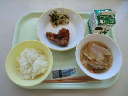 今日の献立は、「牛乳、ごはん、豚肉の竜田揚げ、いり大豆あえ、ワンタンスープ、のりつくだに」です。