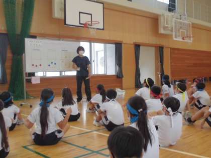 体育科では、「フロアボール」を行っています。今日はチームで作戦を立てました。「レシーブ、セット、アタック」のかけ声に合わせ、チームでボールをつなぐことができるようになりました。