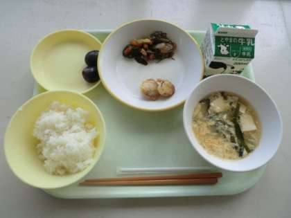 今日の献立は、「牛乳、ごはん、ほたての香味焼き、もずくのチャプチェ、にらたま汁、巨峰」です。