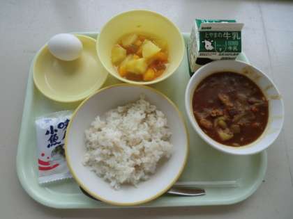 今日の献立は、「牛乳、麦ごはん、カレーライス、ゆで卵、味付け小魚、フルーツゼリーミックス」です。