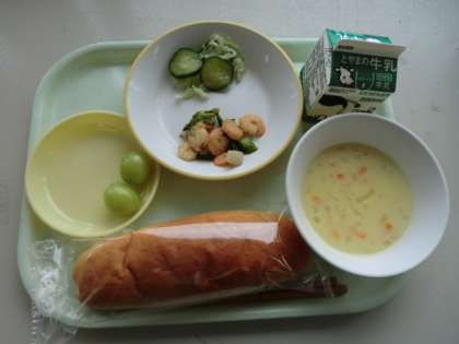 今日の献立は、「牛乳、米粉コッペパン、えびときのこのガーリックソテー和え、そえ野菜、野菜ポタージュ、シャインマスカット」です。