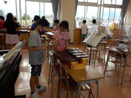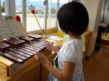 音楽の授業では、オルガンと木琴を使って演奏しています。友だちの音をよく聞いて、続けて自分の演奏をしていました。