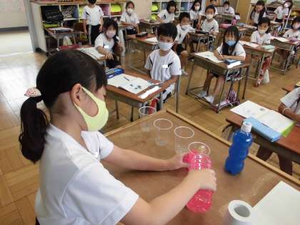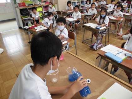 算数科の学習で「どちらがおおくはいるかな」の学習をしています。今日は子供たちが考えた方法で、実際に比べてみました。結果はどうなるかな?と興味津々の子供たちでした。