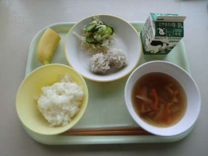今日の献立は、「牛乳、ごはん、チンズワンズ、あわせあえ、くきわかめスープ、バナナ」です。
