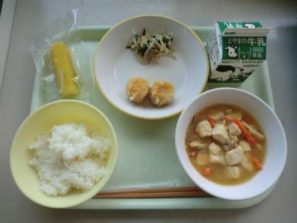 今日の献立は、「牛乳、ごはん、にんじんシューマイ、ナムル、マーボー豆腐、冷凍パイン」です。