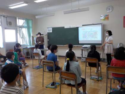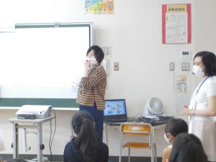 外国語専科の谷井先生とALTのクリス先生と一緒に楽しみながら活動しています。
