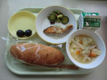 今日の献立は、「牛乳、コッペパン、さけマリネ、ビーンズサラダ、野菜のスープ煮、きょほう」です。