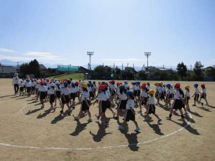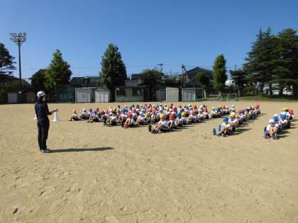 グラウンドで運動会の練習を行いました。走順を確認した後、本番と同じように50m走を走りました。その後、団体競技のダンスの並び方を確認しました。小学校での初めての運動会に向けて、頑張っている子供たちです。