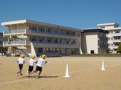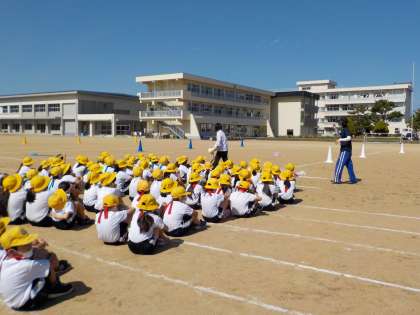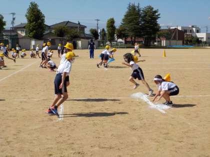今日は、はじめて運動会の団体競技である「巻き起こせ!パワーUP↑ハリケーン」の練習をしました。2人または3人で棒をもち、コーンの周りを通り抜け、ハリケーンを起こします。