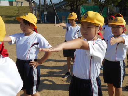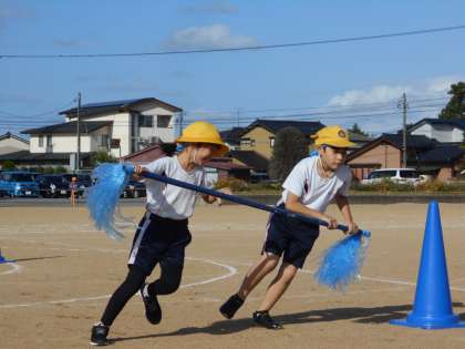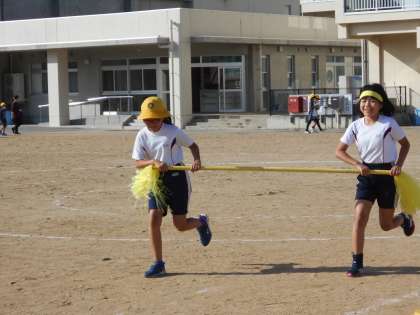 運動会に向けて、団体競技の練習をしています。団ごとに、自分たちで作戦を立て、声をかけあって取り組んでいます。子供たちの様子です。
