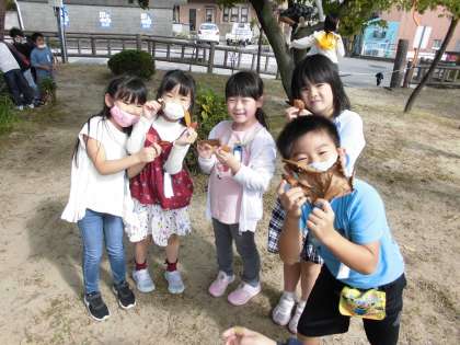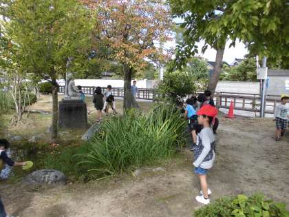 グラウンドを探検して、見付けたものを紹介する文を書く学習を行っています。今日はグラウンドを回って素敵なものをたくさん見付けました。落ち葉や花を見付けてとてもうれしそうな子供たちです。