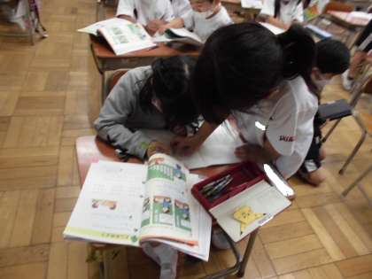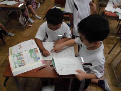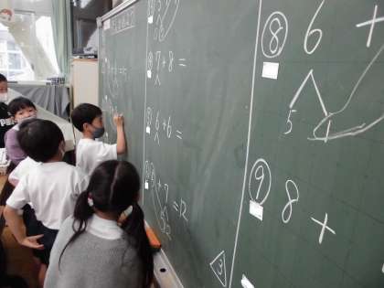 算数の学習では、10を超える足し算の練習をしています。計算の技能を身に付けようとたくさん練習問題に取り組んでいます。分からない時は、友達が教えてあげる様子も見られます。