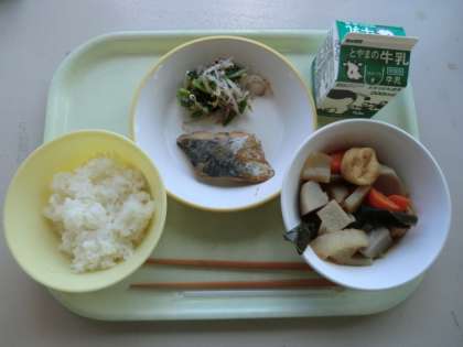 今日の献立は、「牛乳、ごはん、さわらの西京焼き、梅肉あえ、おでん」です。