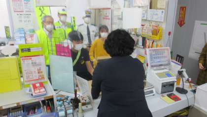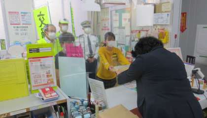 交通安全を願い、6年生が書いた手紙の投函式が行われました。代表の子供たちが新庄郵便局で封筒を手渡しました。