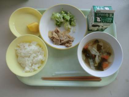 今日の献立は、「牛乳、ごはん、豚肉のシャンロー、そえ野菜、じゃがいものみそ汁、かき」です。