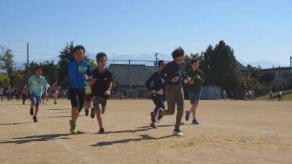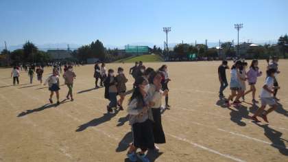 5分間走に取り組む子供たち。秋晴れの下、自分のペースで頑張って走っています。気持ちよさそうに走る、元気な6年生です。