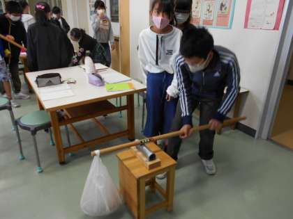 理科で「てこのはたらき」の学習をスタートしました。今日は各班で4kgのおもりをいかに簡単に持ち上げるかについて考えました。その後、それぞれの班のてこを体験する活動を行いました。子供たちは一番簡単だと選ばれた班のてこは、荷物と中心の支えの距離がとても近くなっている工夫があることに気付いていました。