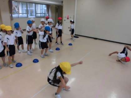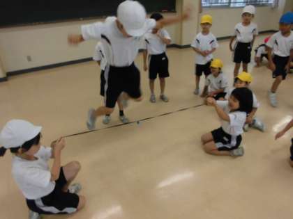今日は、「チャレンジキッズわざ7」の跳ぶあそびに取り組みました。川跳びで遠くに跳んだり、ゴム跳びで高く跳んだりする技に挑戦しました。子供たちは、遠く高く跳ぶ動きを楽しんでいました。