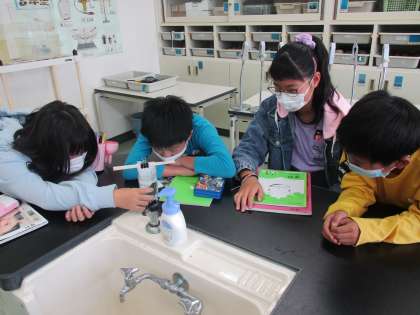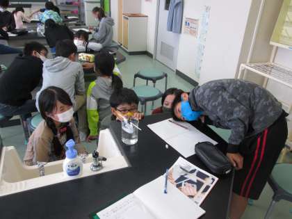 水に食塩を溶かす実験を行いました。水の中でゆらゆらとして見える「シュリーレン現象」に、みんな「すごい」と興味津々でした。